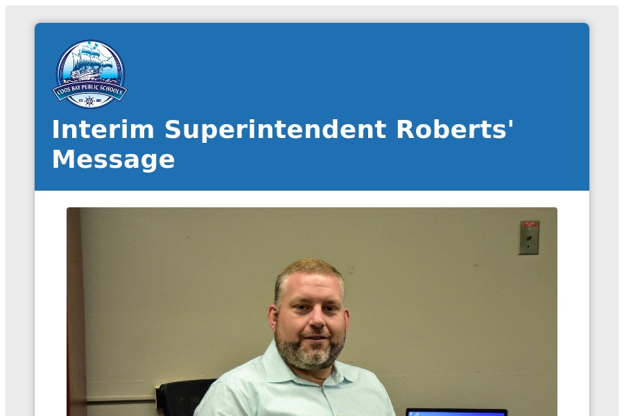 Superintendent Newsletter Interim Superintendent Gary Roberts Coos Bay School's District Office Leadership Team Greetings Coos Bay Community, It's bee. . .